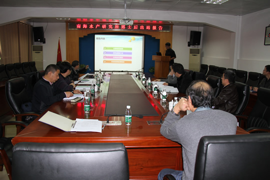 2015??日,中国水产科学研究院南海水产研究所举行博士后出站报告会,马振华博士作在站期间科研工作汇报。评议专家组由中山大学、华南师范大学、华南农业大学、南海水产研究所等单位相关领域的知名专家组成,合作导师南海所江世贵研究员、中科院南海海洋所胡超群研究员,和所内相关学科科研人员等参加了报告会,人事处处长吴冾儿研究员主持报告会?
