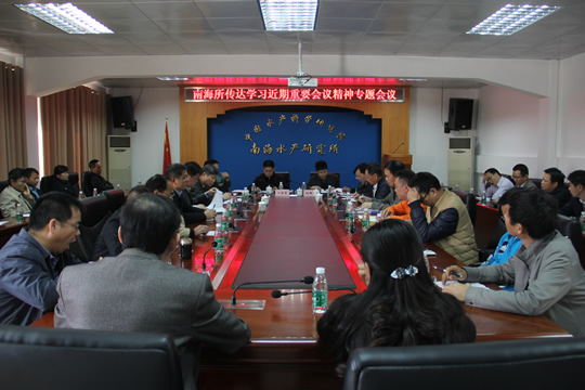 1?2日,中国水产科学研究院南海水产研究所召开专题会议,集中传达学习了近期有关重要会议精神。所党委书记刘新中主持会议,所长江世贵、党委副书记陈平南,副所长杨北胜、李来好、李纯厚,所长助理陈水胜和中层干部、在职党支部书记?0多人参加了会议?/P>
