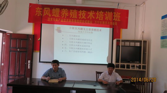 6?0 日,中国水产科学研究院南海水产研究所在海南省万宁市山根镇排溪村举办东风螺养殖技术培训班,国家贝类产业技术体系海南综合试验站站长、南海所海南中心主任吴开畅研究员和万宁市海洋与渔业局负责人共同主持培训,来自该村从事东风螺养殖人员共43人参加了培训?/P>