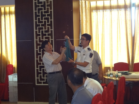 举办此次专题培训班是台山市认真贯彻落实《农业部关于止使用双船单片多囊拖网等十三种渔具的通告》和《关于实施海洋捕捞准用渔具和过渡渔具最小网目尺寸制度的通告》的一项重要举措,得到台山市海洋与渔业局领导的高度重视和广大渔民的积极响应。杨吝研究员在培训班上作了《中国渔具分类与识别》的报告,系统讲解了中国渔具的分类、识别和网目尺寸的测量方法等,并进行了现场演示,以及全面解读了农业部“两个通告”中南海区渔具最小网目尺寸等相关内容,引起了大家的强烈兴趣。渔民代表们在交流互动环节发言踊跃,提出了许多渔业生产上存在的实际问题,杨吝研究员逐一进行了解答,取得了良好的培训效果?/P>