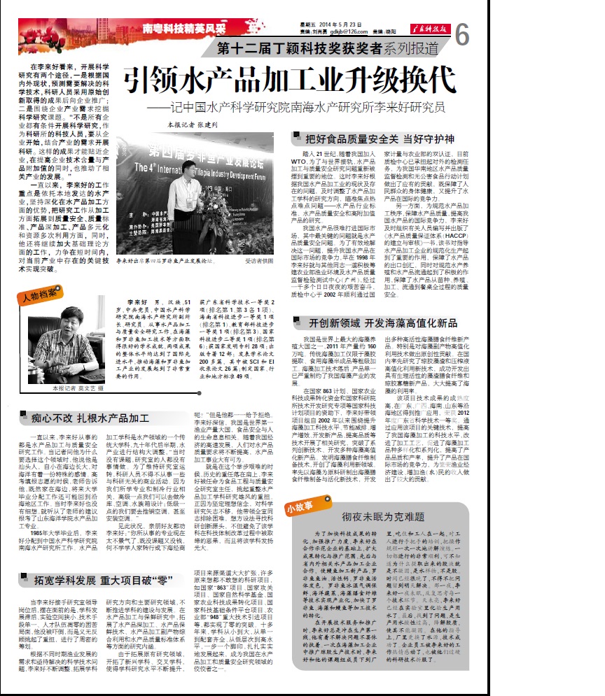 广东科技报对南海所李来好研究员进行专题报道