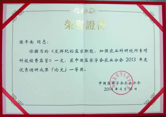 日前,中国监察学会农业分会作出决定,?013年度优秀论文进行通报表彰。此次共?0篇论文被评为优秀论文,其中一等奖6篇、二等奖10篇、三等奖14篇。由中国水产科学研究院南海水产研究所党委副书记、纪委书记陈平南撰写的反腐倡廉理论文章《发挥纪检监察职能,加强农业科研院所专项科技经费监管》被评为2013年度优秀调研成果(论文)一等奖。目前这批优秀论文已挂在中央纪委监察部驻农业部纪检组监察局网站?A >http://www.jcj.moa.gov.cn)?/P>