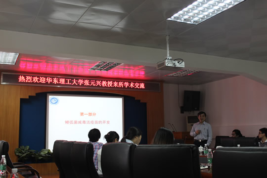 4?9日,应农业部南海渔业资源开发利用重点实验室的邀请,华东理工大学生物工程学院院长张元兴教授到南海水产研究所进行学术交流。南海所副所长李来好主持交流会,所长江世贵、副所长李纯厚和科研处、养殖室、鱼病室等相关处室负责人及专家、联合培养研究生?0多人参加了学术交流?/P>