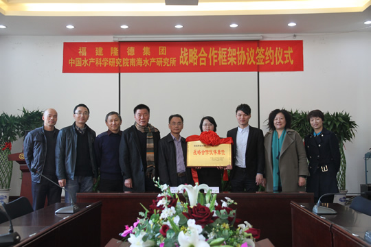 为推进现代海洋农业发展,加强科技成果转化,提升科技创新对海洋农业的支撑引领作用??3日,中国水产科学研究院南海水产研究所与福建隆德集团在福州市举行面向现代海洋农业开发的战略合作协议签字仪式。南海所副所长李纯厚、成果转化处处长于刚、渔业工程研究室副主任张家松和福建隆德集团总裁林仁兴、副总裁许超英、姚兰英、林庆华、张慧等出席了签字仪式?/P>
