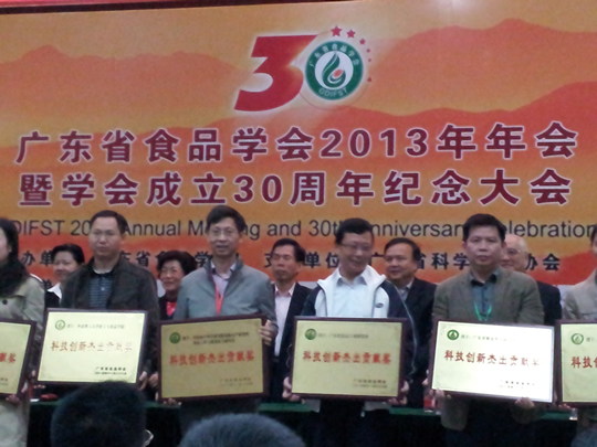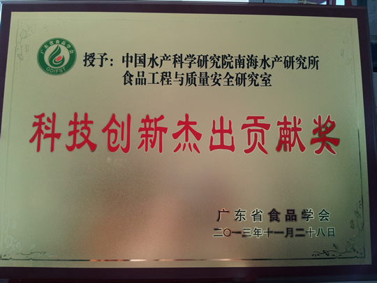 11?8日,在华南理工大学召开的广东省食品学会2013年年会暨学会成立30周年纪念大会上,广东省食品学会对为推动广东食品工业科技进步做出杰出贡献的单位进行了表彰。中国水产科学研究院南海水产研究所食品工程与质量安全研究室被授予“科技创新杰出贡献奖”?/P>