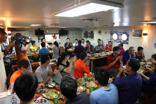 夜晚,大家欢聚一堂,举办欢度中秋晚宴。本航次海上总指挥李纯厚副所长首先转达了中国水产科学研究院院长张显良代表院党组对“南锋”号船全体人员的节日祝贺和亲切慰问,宣读了南海水产研究所所长江世贵和党委书记刘新中发来的节日慰问电,并回顾了“南锋”号??日启航以来取得的重大科考进展,对全体人员在恶劣艰苦的条件下克服晕船等各种困难,出色完成阶段性科考任务给予了高度评价。随船央视记者姜恺转达了CCTV-7《科技苑》栏目组领导对“南锋”船全体人员诚挚的节日问候和良好祝愿?/P>