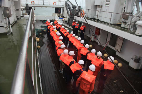 随后,“南锋”号全体人员根据航次工作部署进行了救生演练。通过开展反抓捕、反劫持及救生演练,不仅进一步完善了“南锋”船应对突发事件的预警机制,更明显提高了全船人员应对突发事件的反应能力,增强了信心和斗志,有利于切实维护人员生命安全和财产安全、保障科研任务圆满完成?/P>