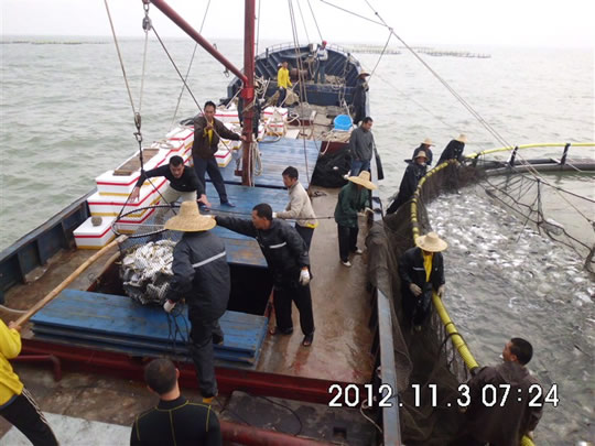 图为阳江海纳深水网箱产业园区收获卵形鲳鲹,养?80天达700?尾;年产25吨箱