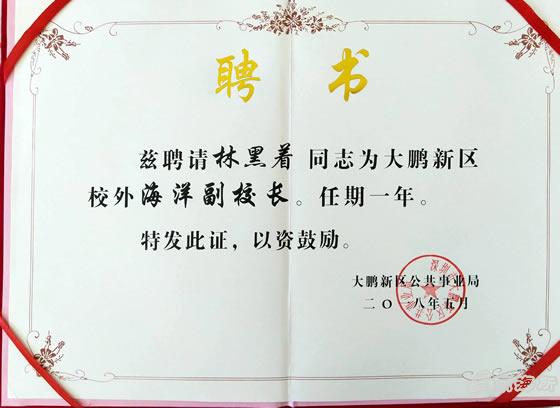5?6日,由大鹏新区公共事业局组织发起的深圳市大鹏新区首批“校外实践基地”授牌仪式在大鹏中心小学举行,中国水产科学研究院南海水产研究所深圳试验基地成为首批19家学生社会实践基地之一,深圳基地主任林黑着研究员被聘为“海洋副校长”,科研骨干黄小林被聘为“校外辅导员”?/p>