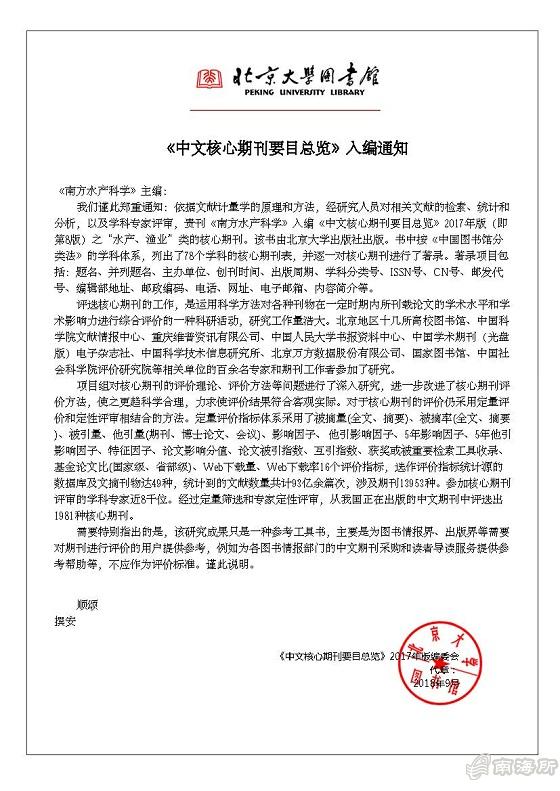 近日,中国水产科学研究院南海水产研究所主办的《南方水产科学》编辑部收到通知,《南方水产科学》入编北京大学《中文核心期刊要目总览?017年版(即?版)之“水产、渔业”类的核心期刊,这是该期刊自2011年以来第三次入编《中文核心期刊要目总览》,且在水产渔业类的学科排名连续上升,显示了良好的学术影响力和发展态势?/p>