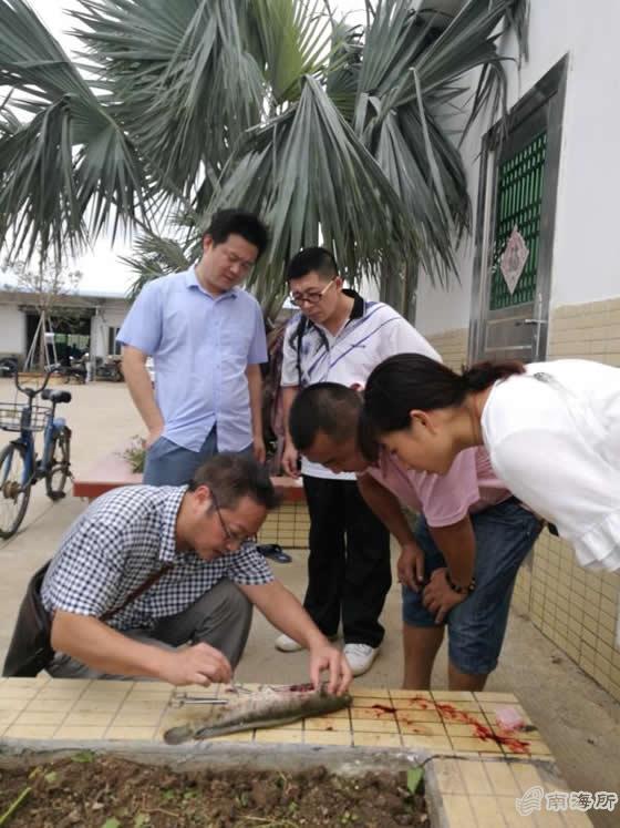 南海所专家组与各养殖企业技术员、养殖户进行深入交流,仔细询问灾前、灾后对养殖池塘鱼所采取的防护措施、饲料投喂、使用药物(或生物制剂)等情况,认真为养殖企业问诊把脉,对症下药,为受灾企业解决灾后渔病防治的养殖难题。其中,在乾务强竞公司养殖场,专家组有针对性提出继续做好养殖池塘配套设施、把进水口和出水口区分开、做好水体消毒、内服增强营养免疫的添加剂、对影响较大的池塘进行修补和补苗、做好鱼塘藻相和菌相的培养、稳定水质等措施建议;在斗门嘉宜、金湾年丰等企业,专家组现场讲解了指环虫感染和诺卡氏菌病缺少合适的治疗方法和手段,以及鲫鱼和鮰鱼养殖过程调水方法以及pH、磷酸盐和氨氮对养殖鱼的影响等内容。王江勇、徐力文等专家为了更准确诊断鱼病,还现场解剖病鱼,向养殖户介绍鱼病特点和诊状,传授治疗的方法与措施?/p>
