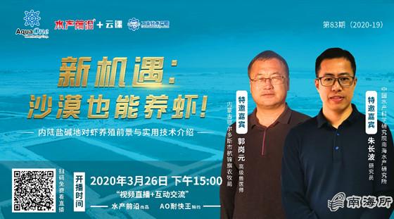3?6日,南海所水产养殖与遗传育种研究室副主任朱长波研究员应《水产前沿》杂志社邀请,做客水产前沿?8期(2020-19)农牧学堂微信直播平台,做了主题为“内陆盐碱地对虾养殖前景与实用技术”的云课堂技术讲座,基于在内蒙古沿黄盐碱地开展对虾养殖技术推广的经验,从内陆盐碱地对虾养殖开发现状、内陆盐碱地发展对虾养殖业的优势和存在的问题、盐碱地对虾养殖关键技术等三个方面进行了分享,并与观看直播?.61万养殖从业者进行了互动交流,认真回答了有关盐碱地养殖开发的技术疑难问题,给正在养殖和计划开展盐碱地对虾养殖的从业者以有力指导,增强了从业信心决心,取得良好效果?/p>