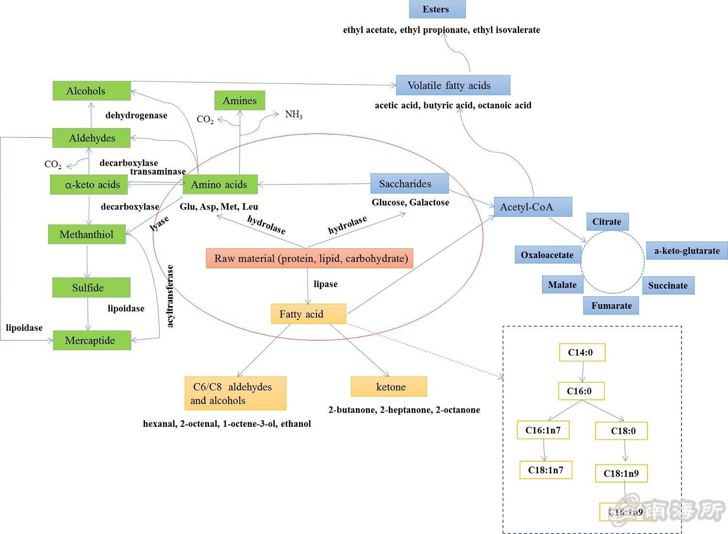 该研究利用分子感官和风味组学技术对传统发酵鱼露风味进行量化表征,利用宏基因组学技术对微生物群落演替进行分析,借助代谢网路模型挖掘风味形成功能核心微生物菌群,基于“代谢产?微生?基因”多维度、多尺度、可视化揭示了微生物代谢调控对传统鱼露风味形成机制,研究发现在传统鱼露发酵体系中挥发性风味物质形成主要以单糖代谢途径、氨基酸代谢途径和脂肪酸代谢途径为基础,经过多种降解代谢途径生成相应的挥发性风味物质,其中醛酮类风味化合物主要来源于氨基酸发生streker降解反应与不饱和脂肪酸的氧化降解,?酮酸作为氨基酸代谢途径中的关键节点化合物,在醛酮类风味化合物的形成过程中?酮酸在不同支链氨基酸转氨酶的作用下生成相应的醛酮类物质,醇类风味物质主要以Ehrlich 途径和Harris 途径为主?/p>