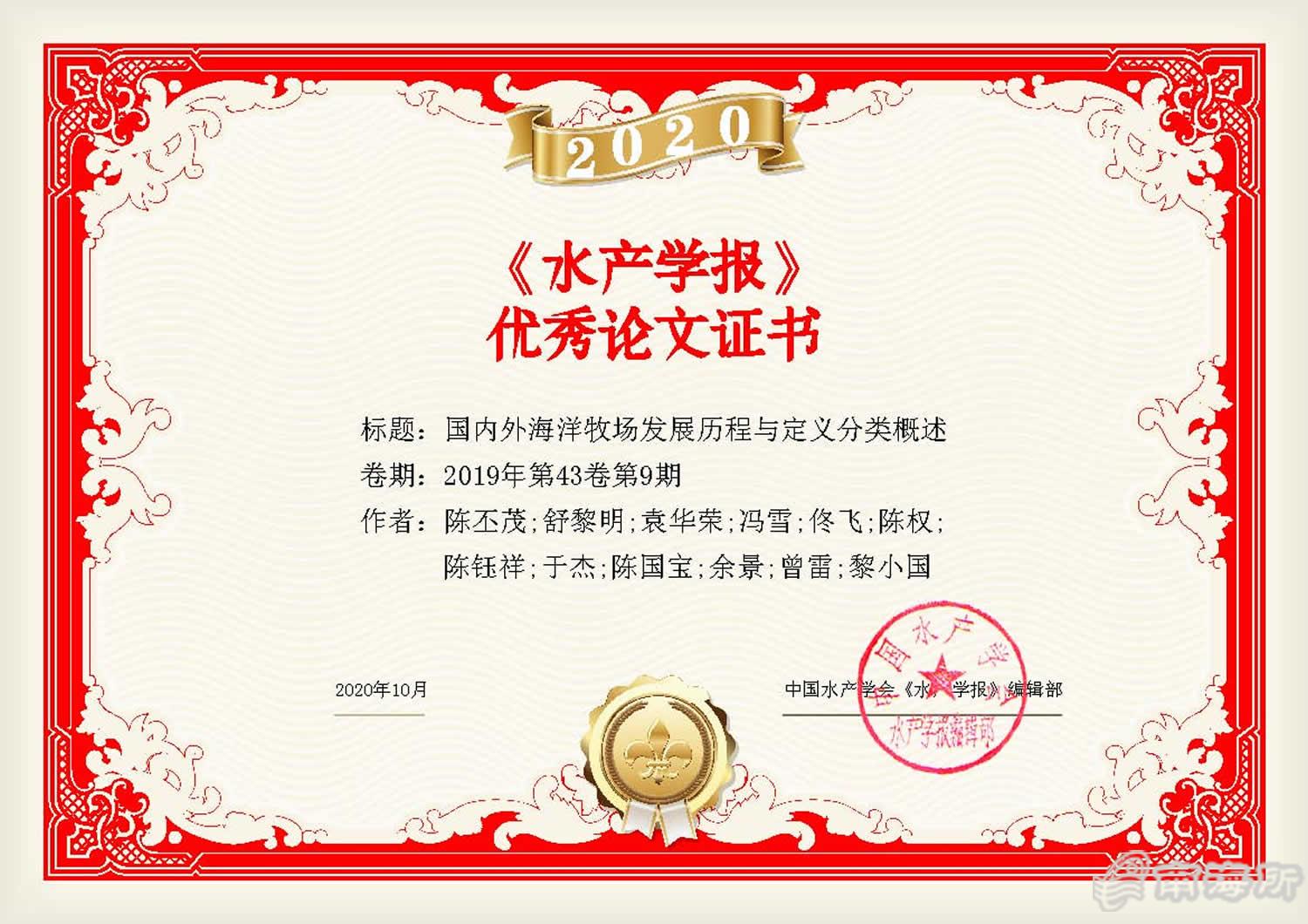 近日,中国水产学会《水产学报》根据独家文献收录机构《中国知网》提供的论文下载频次、论文引用次数及学术影响力等统计指标,从2019年发表的192篇论文中,评选出20篇高被引优秀论文。中国水产科学研究院南海水产研究所陈丕茂、舒黎明、袁华荣等发表的《国内外海洋牧场发展历程与定义分类概述》榜上有名,成为20篇高被引优秀论文之一?/p>