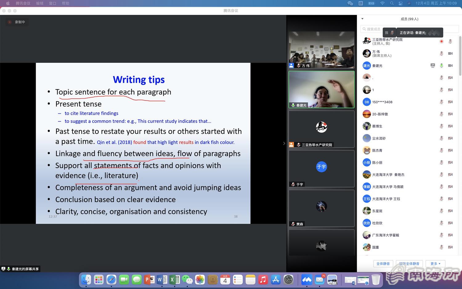 秦建光教授围绕此次“如何提高英文科技论文质量及投稿成功率”的主题,重点对英文写作涉及的标题、摘要、前言、材料与方法及结果、讨论等环节进行了详细讲解,包括基本功能、技能要点及注意事项等,同时表达了“科学研究要追求严谨,而论文写作是在严谨的科研基础上将研发成果进行呈现的过程”等观点。秦教授还以评审者的角度剖析了科研人员在写作、投稿及回修过程中常见的错误操作及纠正方法,建议大家写作前做好充足准备,包括严密的实验计划、相关文献的拜读学习及实操构思等,提醒大家要在文化差异、动物伦理及期刊特性等方面多下功夫,并在最后强调指出,尽管现今“唯论文论英雄”已被逐渐质疑及否定,但写作仍然是一名科研人员必须坚持的事业,甚至是其一辈子应承担的责任,将个人研发成果通过论文传播出去并产生影响,是实现科研价值的重要途径,让与会人员感受深刻、受益匪浅,更加坚定了做好科研的信念、写出好文章的决心?nbsp;