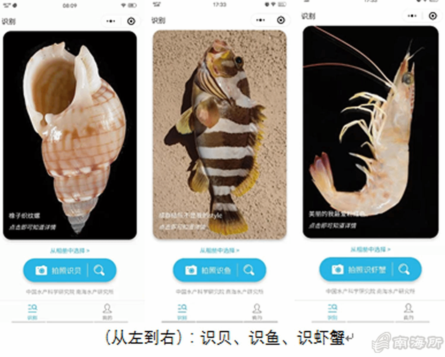 南海所研发的“识贝”是一款微信小程序,可识别我国920种常见的贝类,由于识别较为准确快速,界面精美,识别结果详细,受到相关从业人士的广泛欢迎。近年来,南海所相关研究团队凭借在海洋调查、生物鉴定方面的科技和人才优势,经多次筛选、鉴定,形成质量较高的数据集,再利用人工智能中的深度学习技术,经过反复多次的参数调校,得到准确稳定的模型,除开发出“识贝”外,还开发了“识鱼”、“识虾蟹”、“识水生保护动物”、“南海小渔”等系列微信小程序,可对我国1600种鱼类?04种虾蟹类?00余种水生保护动物进行高效识别,为促进社会公众对水生生物的了解关爱,提升水生生物资源保护意识以及为水野救护、增殖放流、捕捞管理提供帮助?br>