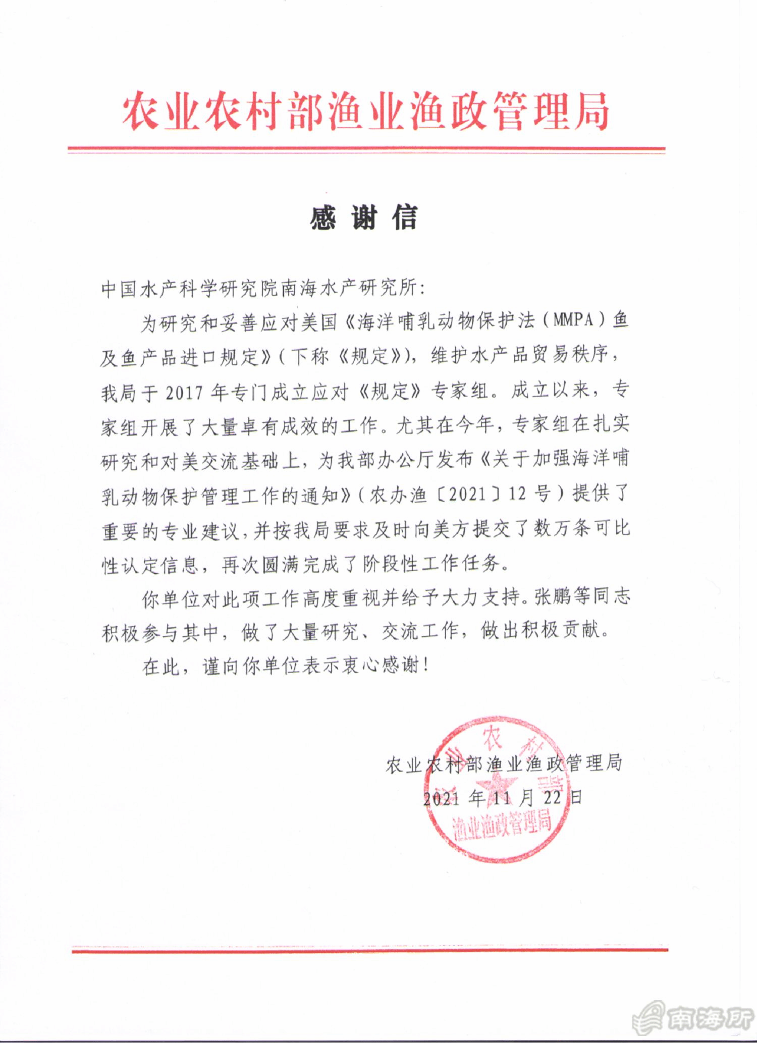 近日,农业农村部渔业渔政管理局专门致信中国水产科学研究院南海水产研究所,感谢南海所对我国研究和妥善应对美国《海洋哺乳动物保护法(MMPA)鱼及鱼产品进口规定》工作的高度重视和大力支持,并特别感谢渔业资源研究室张鹏副研究员等专家的出色表现和积极贡献?/p>