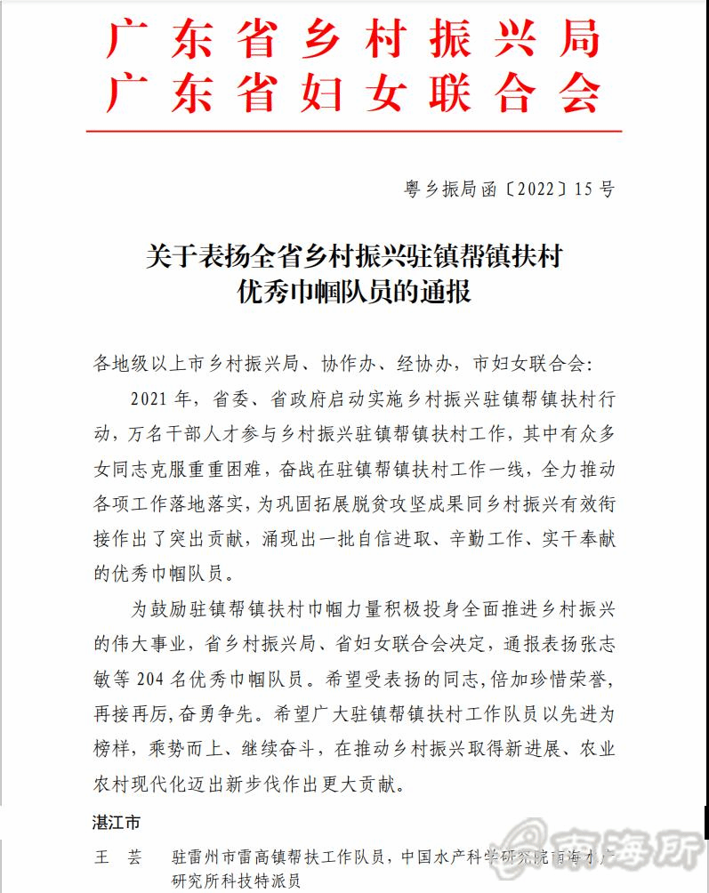 近日,由广东省乡村振兴局和广东省妇女联合会开展的“全省乡村振兴驻镇帮镇扶村优秀巾帼队员”评选结果出炉,全省?04名优秀巾帼队员获得通报表扬。中国水产科学研究院南海水产研究所广东省驻镇帮镇扶村科技特派员(第一批)王芸博士名列其中?/p>