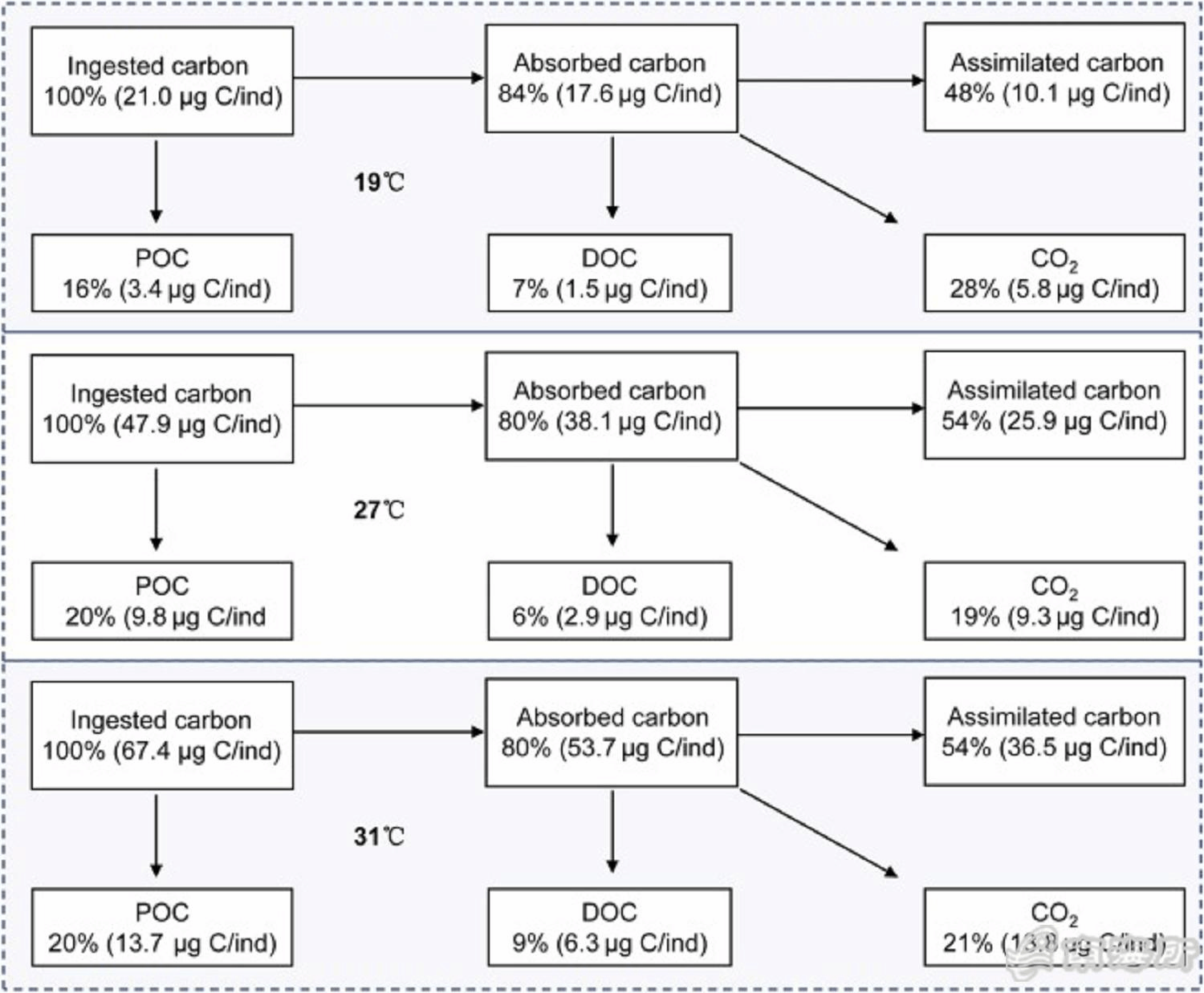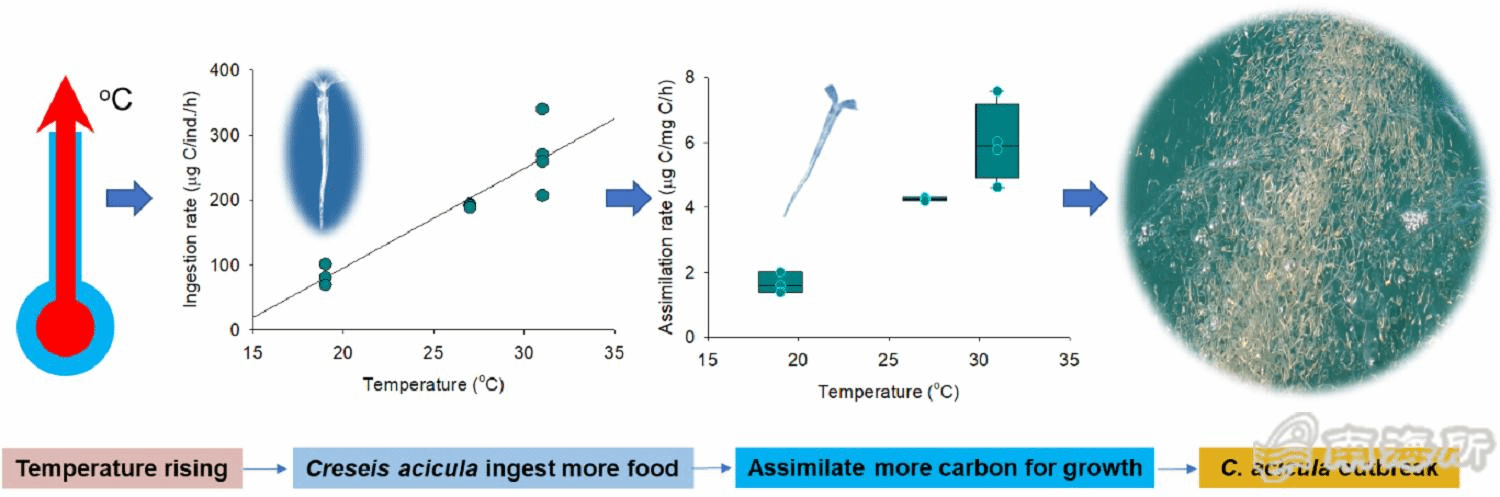 研究结果表明,在19-31℃范围内尖笔帽螺的摄食率、同化速率以及碳代谢排放随温度升高显著提高,温度升高会显著增强尖笔帽螺的摄食、新陈代谢和生长。相关研究工作证实了核电温排水的温升效应可能是导致尖笔帽螺暴发的重要原因之一,初步揭示了温升对尖笔帽螺暴发的作用机制。相关成果也提示,在全球海洋升温大背景下,尖笔帽螺暴发风险可能会增加?/p>