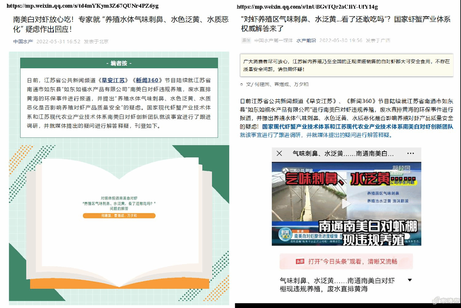 此前,江苏省公共新闻频道《早安江苏》《新?60》等节目陆续对江苏省南通市如东县“如东如福水产品有限公司”违规养殖南美白对虾、废水直排黄海的环保事件进行了报道,并提出养殖水体气味刺鼻、水色泛黄、水质恶化是否影响养殖对虾产品质量安全的疑虑?/p>