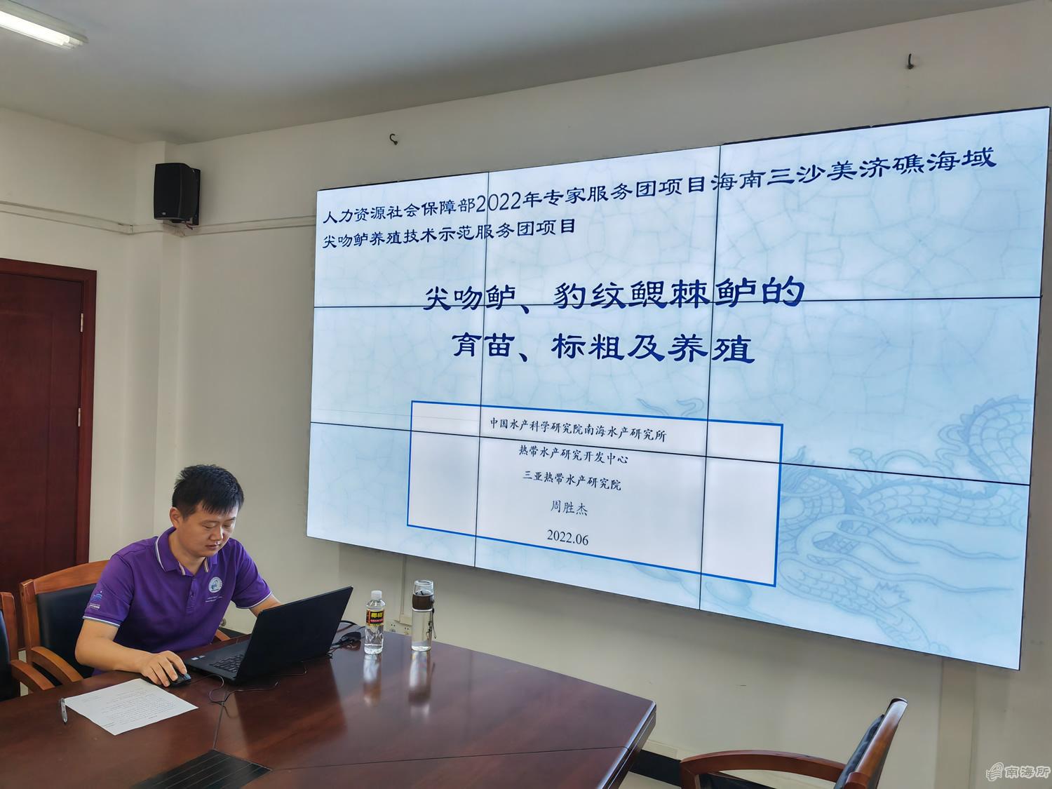 近日,中国水产科学研究院南海水产研究所三亚热带水产研究院通过线上和线下相结合的方式组织开展水产养殖技术培训。来自海南省三沙市、陵水县的水产养殖户60余人参加了技术培训。此次培训是中共海南省委人才发展局组织、三亚热带水产研究院实施的人力资源和社会保障?022年专家服务团项目——海南三沙美济礁海域尖吻鲈养殖技术示范服务项目的一项重要内容?/p>