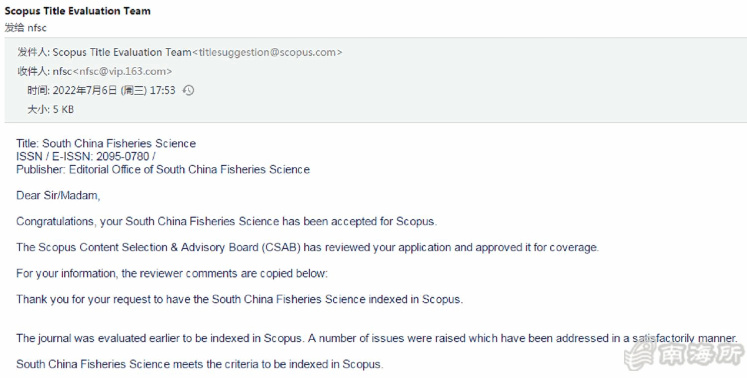 近日,《南方水产科学》编辑部收到Scopus Title Evaluation Team的邮件通知,由中国水产科学研究院南海水产研究所主办的学术期刊——《南方水产科学》已通过Scopus内容遴选与审查委员?(Content Selection & Advisory Board,CSAB) 的评估,被Scopus数据库收录。这表明《南方水产科学》的学术质量、影响力、标准化、规范化等进一步得到国际认可?/p>