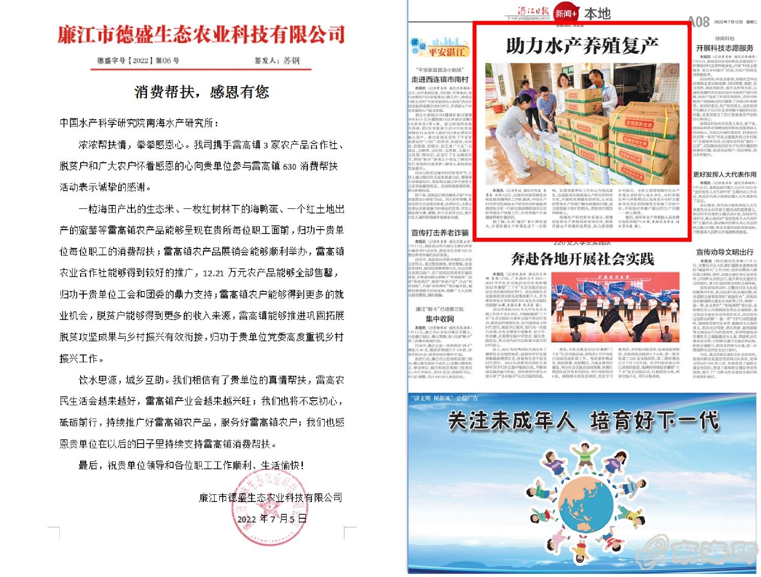此前,为巩固脱贫攻坚成果,做好与乡村振兴有效衔接,南海所作为雷高镇驻镇帮镇扶村成员单位,通过消费帮扶方式,推广了3家雷高镇农业合作社和多种农产品,帮助雷高镇农户解决了农产品滞销的问题,增加了农户的收入。廉江市德胜生态农业科技有限公司还特地为此发来感谢信?/p>