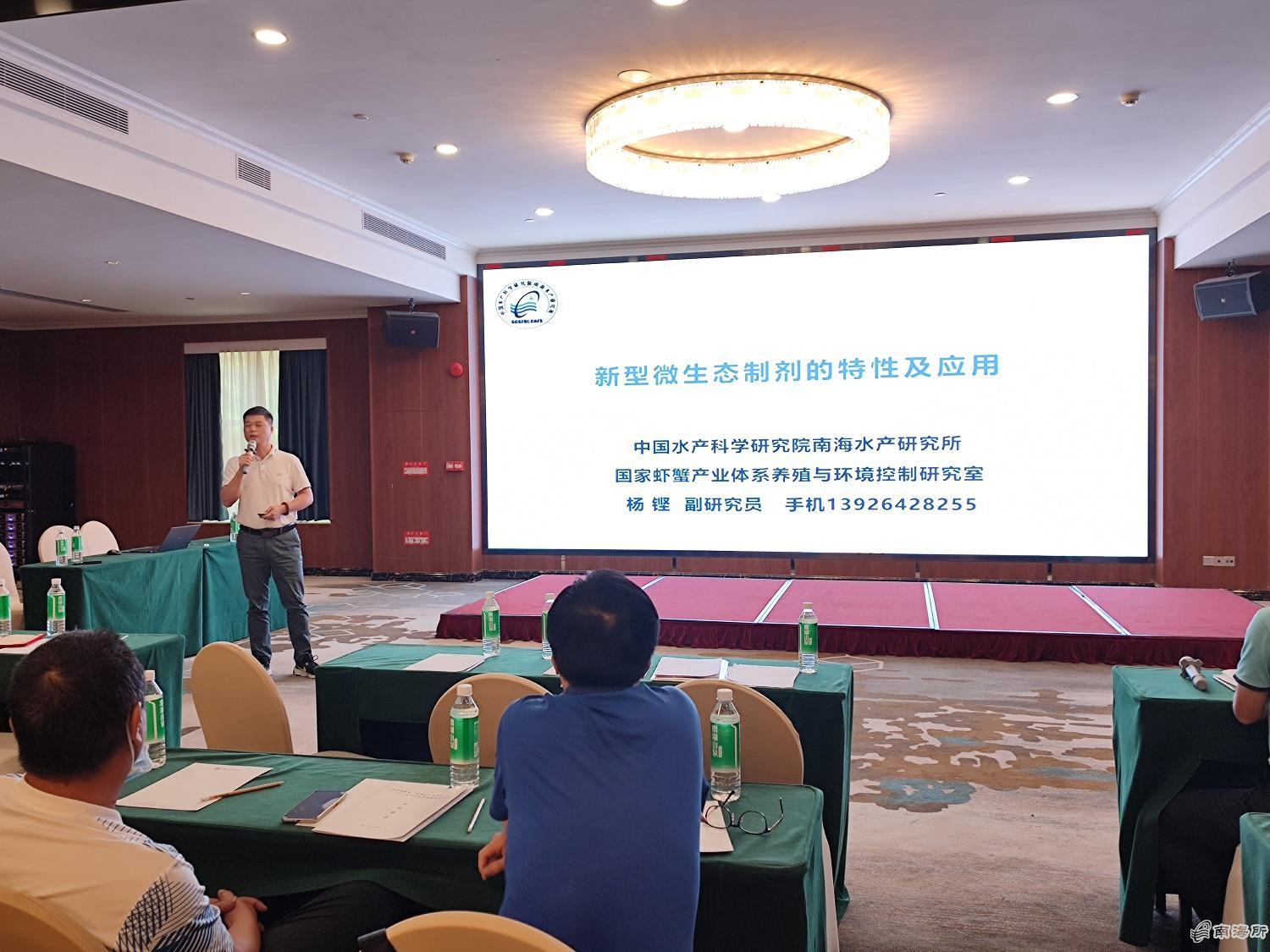 南海所杨铿副研究员为此次培训作了题为“新型微生态制剂的特性与应用”的报告,强调微生态制剂的应用作为抗生素的替代品,已逐渐成为水产养殖动物病害防治的一种生物控制模式,并围绕对虾良种与繁育、微生态应用等专题与参会代表们进行了互动交流,引起了大家针对生产中的水产良种与生态养殖的实践问题的热烈讨论?/p>