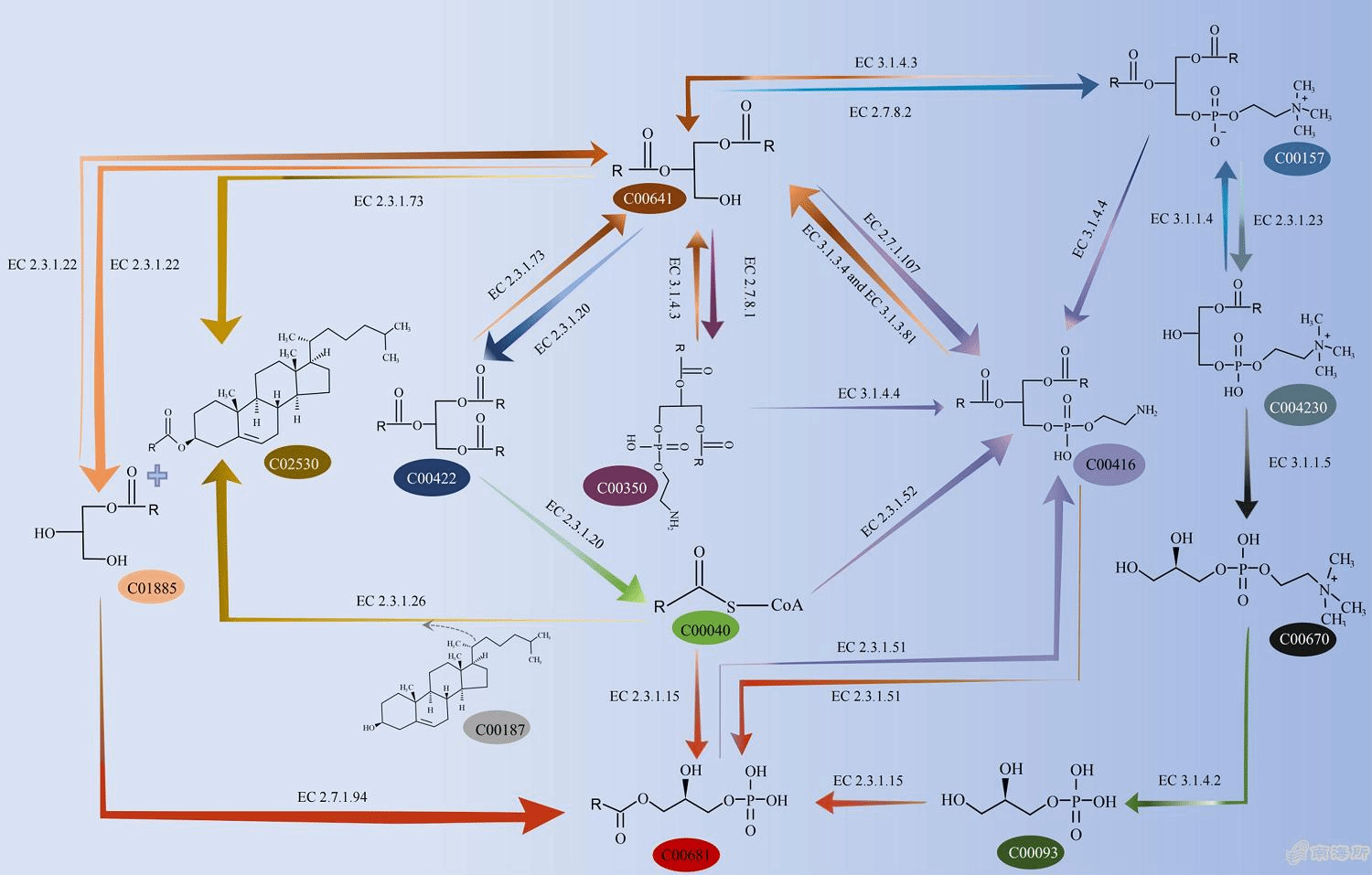 该研究结果表明,差异脂质分子主要来自甘油磷脂代谢途径,可能参与LA代谢、α-亚麻酸代谢、糖基磷脂酰肌醇-锚生物合成、甘油酯代谢、花生四烯酸代谢和类固醇生物合成。PE、PC和溶血磷脂酰胆碱(LPC)是发酵卵形鲳鲹中与甘油磷脂代谢途径相关的主要脂质。LPC可以在磷脂酶A2(EC 3.1.1.4)的作用下由PC水解产生。LPC和酰基辅酶A可以在溶血磷脂酰基转移?(EC 2.3.1.23)存在下形成PC?/p>