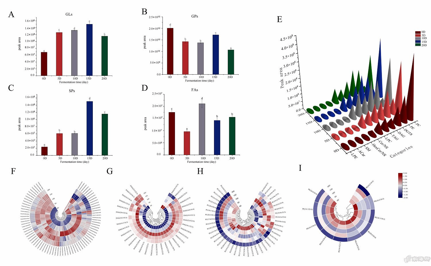 ?2 传统卵形鲳鲹发酵过程中特定脂质种类的变化。(A-D)甘油酯、甘油磷脂、鞘脂和脂肪酸在不同发酵时间的峰值强度(不同小写字母表示差异性显著,p< 0.05 );(E)四个脂类中相应亚类的峰值强度;(F-I)第 0??0?5 ?0 天甘油三酯(F)、甘油二酯(G)、磷脂酰胆碱(H?和磷脂酰乙醇胺(I)分子的热图?/a>