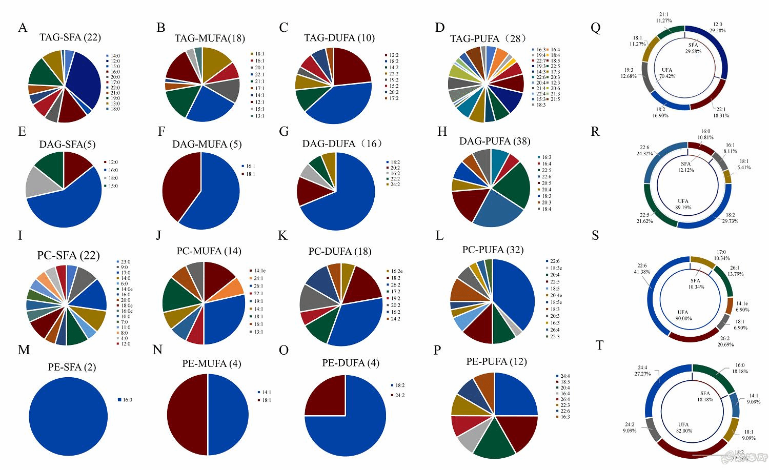 ?(A-T)发?0天后卵形鲳鲹中的甘油三酯、甘油二酯、磷脂酰胆碱和磷脂酰乙醇胺中的脂肪酸类型,以及这些脂肪酸中饱和脂肪酸和不饱和脂肪酸的比例。饼图中不同颜色的区域代表不同脂肪酸的比例?/p>