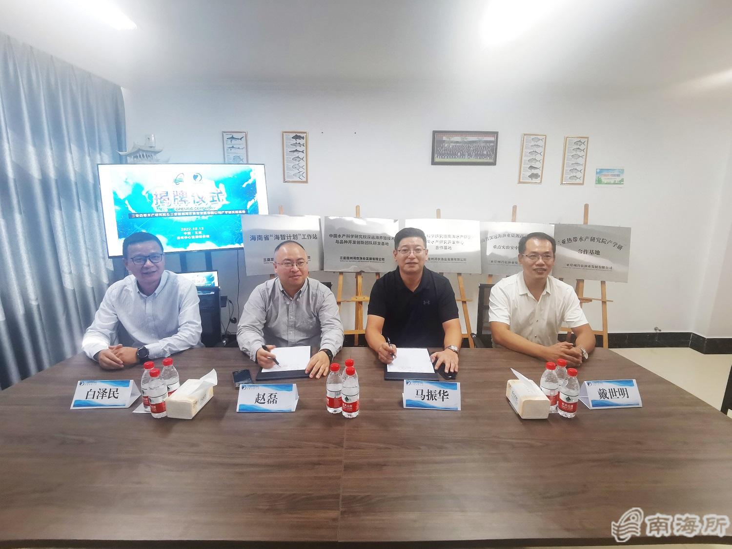 仪式现场,赵磊总经理和马振华常务副院长代表合作双方在框架合作协议上签字。随后,中国水产科学研究院南海水产研究所热带水产研究开发中心合作基地、中国水产科学研究院深远海养殖技术与品种开发创新团队研发基地、海南省深远海渔业资源高效利用与加工重点实验室中试基地、海南省“海智计划”工作站、三亚热带水产研究院产学研合作基地在三亚崖州湾农渔业发展有限公司正式挂牌?/p>