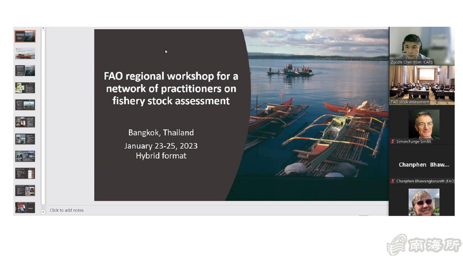 2023??3日至25日,联合国粮农组织(FAO)主办、联合国粮农组织亚太区域办事处(FAORAP)和亚洲水产学会共同组织的“亚洲区域渔业资源评估专家研讨会”,以线上线下相结合的方式在泰国曼谷举行。来自中国、泰国、印度尼西亚、越南、马来西亚、菲律宾、柬埔寨、印度、马尔代夫、斯里兰卡、孟加拉国等10多个国家?3名渔业资源评估专家代表参加会议。中国水产科学研究院南海水产研究所院级“南海渔业资源调查与评估”创新团队陈作志研究员、张魁副研究员应邀线上参会?/p>