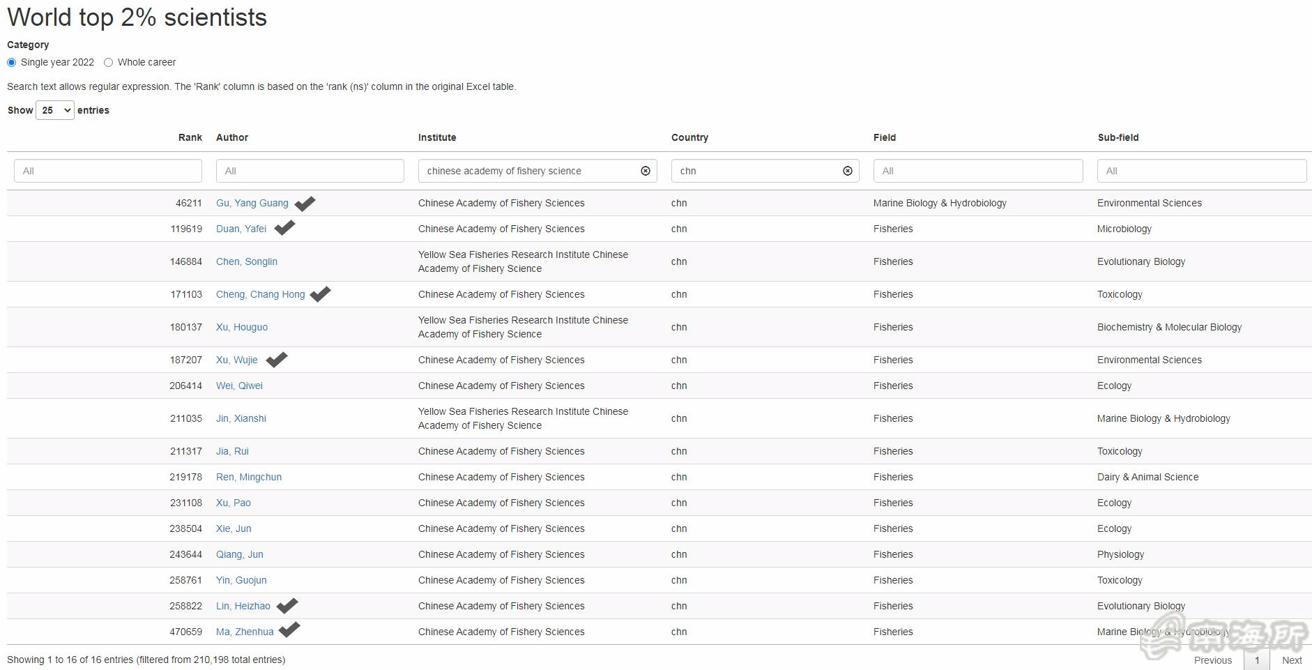 南海所此次入?位专家的研究方向涵盖渔业生态环境保护、水产健康养殖、渔业病害防治、对虾工程化健康养殖、水产动物营养与饲料、海水鱼类繁育及深远海养殖等多个学科领域。入选全球前2%顶尖科学家榜单,意味着该专家学者在其研究领域具有较高的国际影响力,为该领域的发展做出了重要贡献,同时也展现出其所在单位在高层次人才队伍建设方面取得了显著成效?/p>