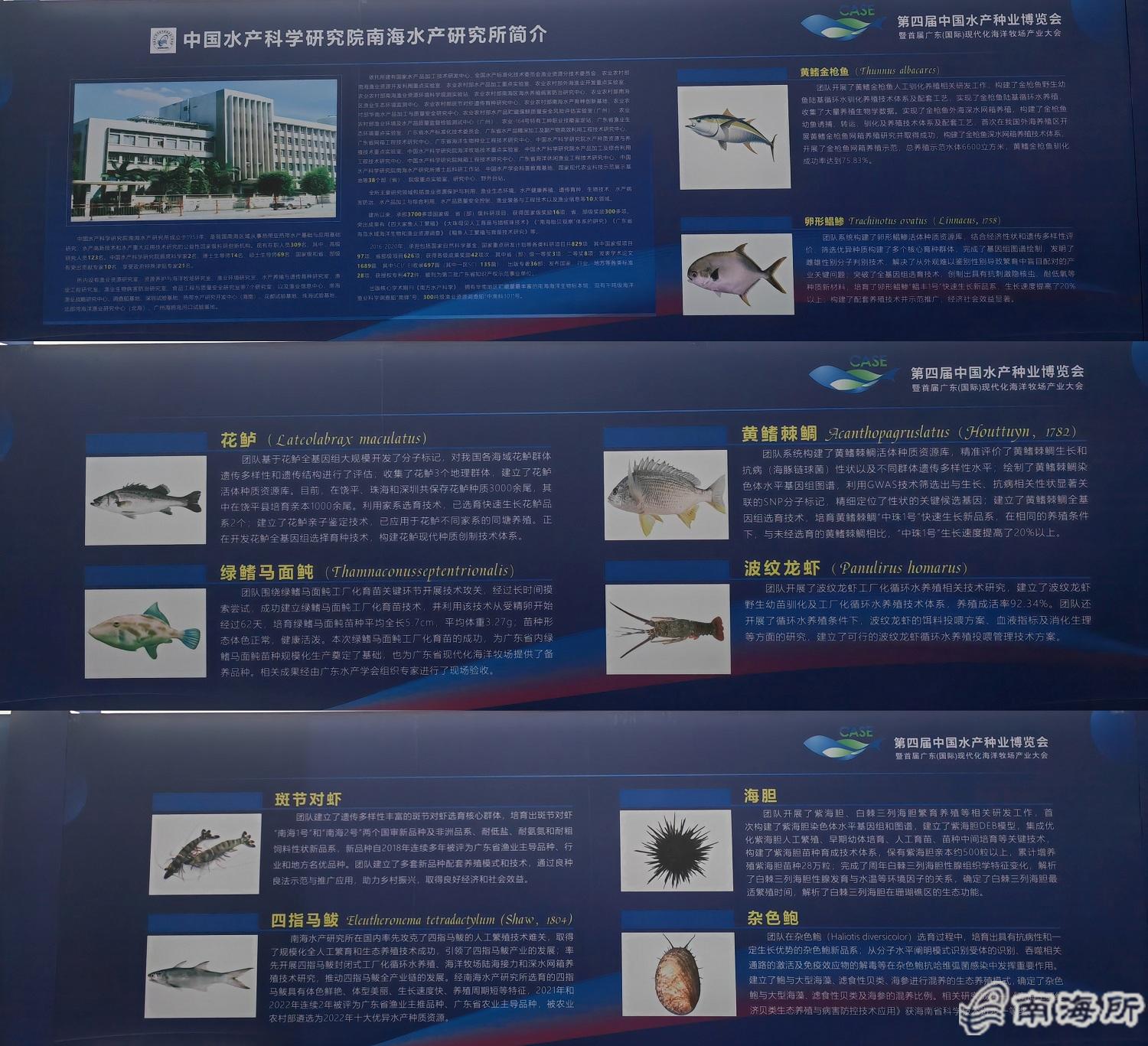 南海所此次参展突出“陆海谋新篇 良种创未来”主题,通过展板、宣传手册、活体等多种方式,充分展示和推介了包括黄鳍金枪鱼、海鲈(花鲈)、卵形鲳鲹、绿鳍马面鲀、黄鳍棘鲷、波纹龙虾、斑节对虾、四指马鲅、海胆、杂色鲍?0个主要品种和微生态制剂成果,对进一步深化南海所科技交流合作、推介优势技术及项目、促进科技成果转化等发挥了良好效果?/p>