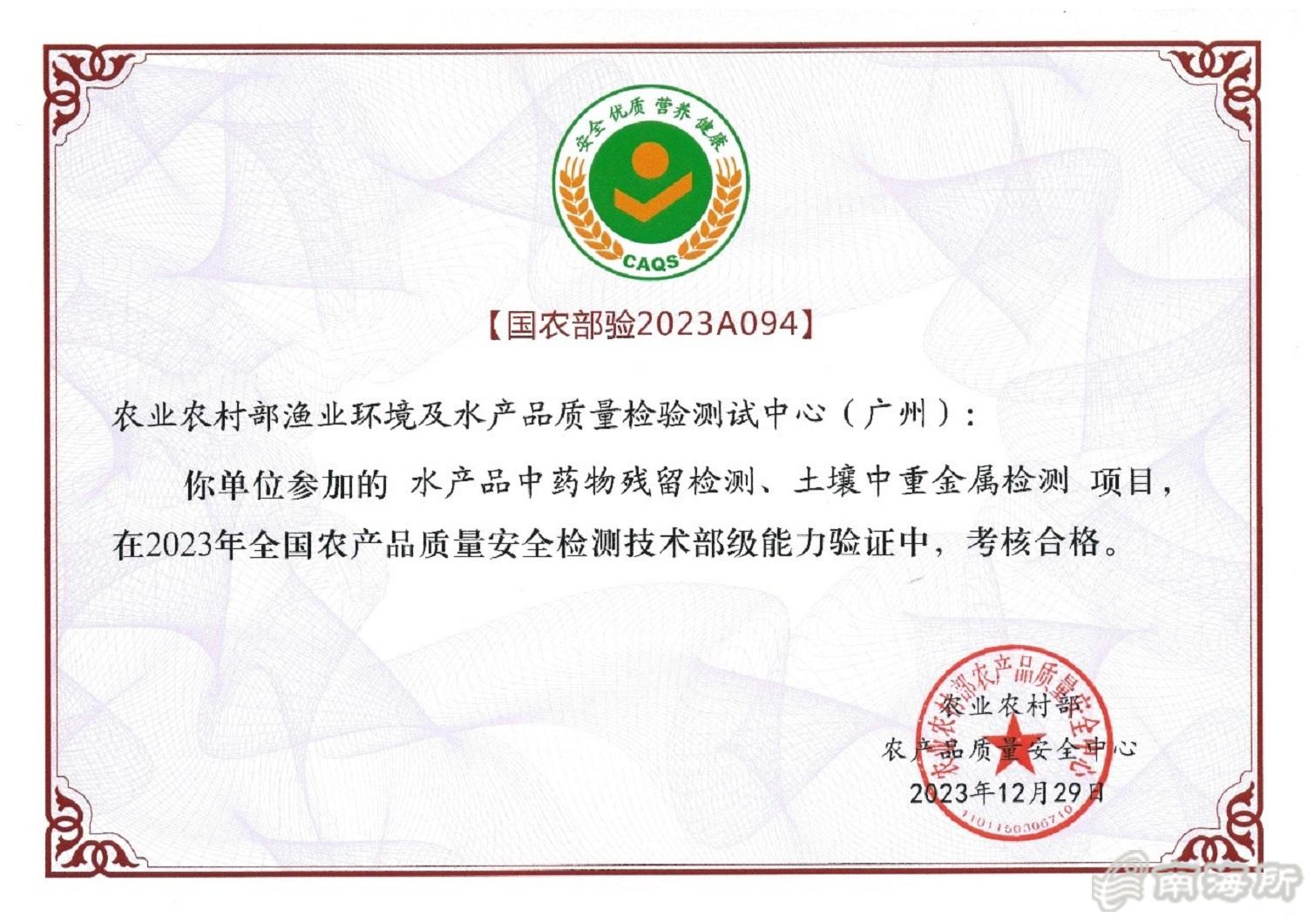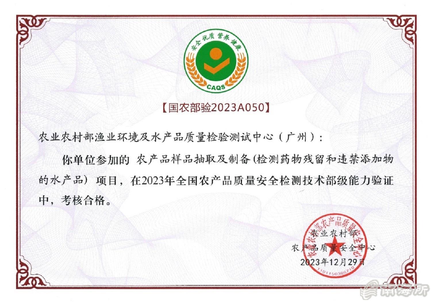 近日,依托中国水产科学研究院南海水产研究所建设的农业农村部渔业环境及水产品质量检验测试中心(广州)(以下简称“部质检中心”)参加由农业农村部农产品质量安全监管司组织?023年全国农产品质量安全检测技术部级能力验证,项目包括水产品中药物残留检测、土壤中重金属检测,农产品样品抽取及制备等,考核合格并取得证书?/p>