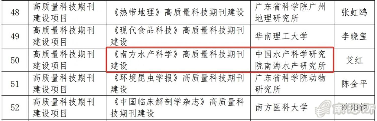 2024?月,广东省科技厅公布了2024年度高水平科技期刊建设拟立项清单,由中国水产科学研究院南海水产研究所主办的学术期刊《南方水产科学》凭借突出的表现和影响力,成功入选“高质量科技期刊建设项目”资助名单(注:7月底项目任务正式下达,资助金?00万元)?/p>