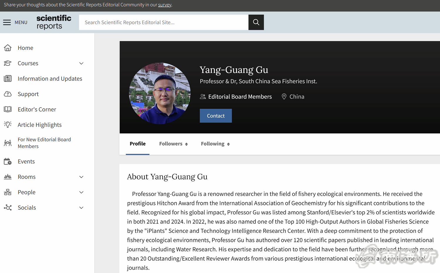 谷阳光研究员曾获国际地球化学学会(IAGC)Hitchon奖(排名第一)和广东省环境科学学会生态环境青年科技奖,多次入选全球前2%顶尖科学家榜单,并位列全球渔业学Top 100高产作者榜单。他主笔的渔业生态环境评估报告已被纳入国家最高人民检察院典型案例?/p>