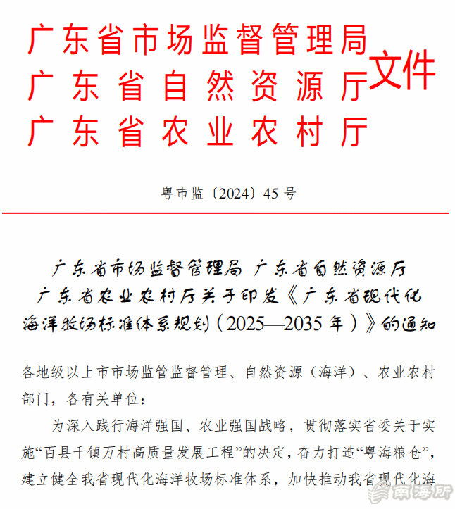 近日,以中国水产科学研究院南海水产研究所为支撑单位的广东省水产标准化技术委员会秘书处起草编写的《广东省现代化海洋牧场标准体系规划(2025?035年)》,由广东省市场监督管理局联合广东省自然资源厅和广东省农业农村厅发布。该规划是在广东省市场监督管理局、广东省农业农村厅等主管部门的指导下由水产标准化技术委员会赵永强、杨贤庆、潘创、魏涯和龙晓珊等院级海水产品品质评价与调控创新团队专家编制起草?/p>