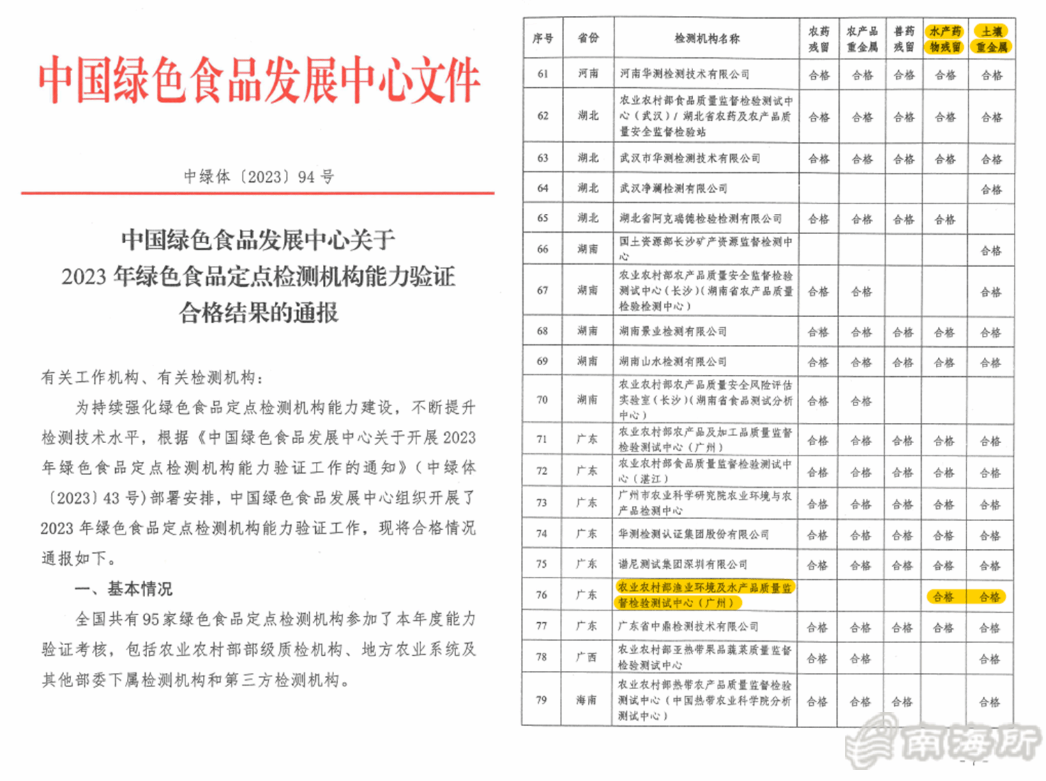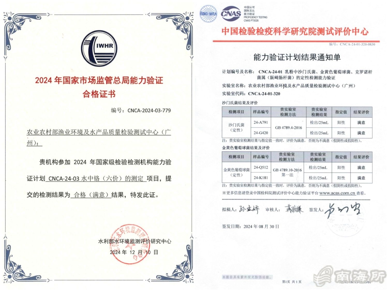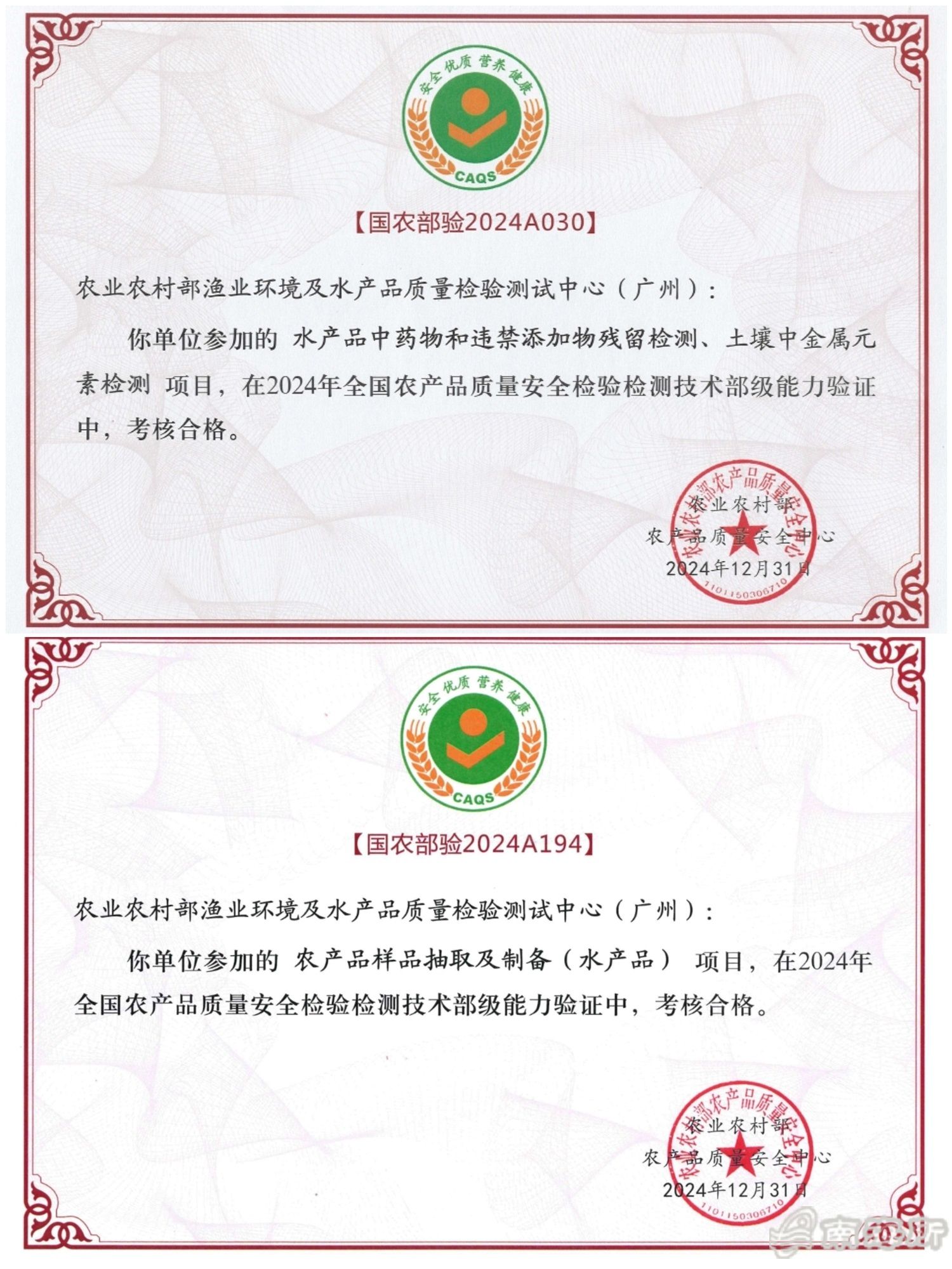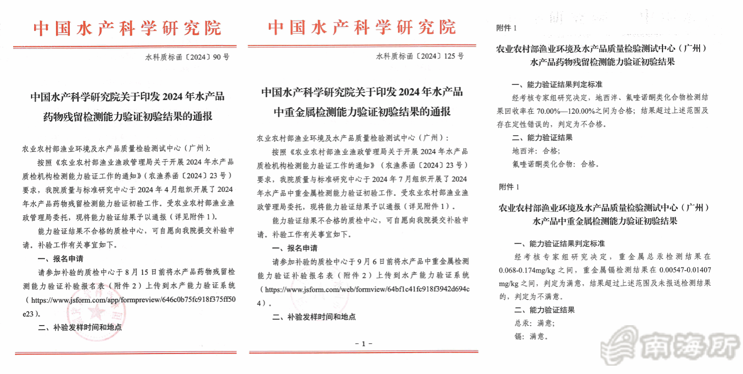 近日,依托中国水产科学研究院南海水产研究所建设的农业农村部渔业环境及水产品质量检验测试中心(广州)(以下简称“部质检中心”)通过由农业农村部农产品质量安全监管司组织?024年全国农产品质量安全检测技术部级能力验证,考核合格并取得证书。能力验证项目包括:水产品中药物残留检测、水产品中重金属残留检测、土壤中重金属残留检测、水中六价铬、乳粉中沙门氏菌、金黄色葡萄球菌的检测、样品抽取及制备等方面?/p>