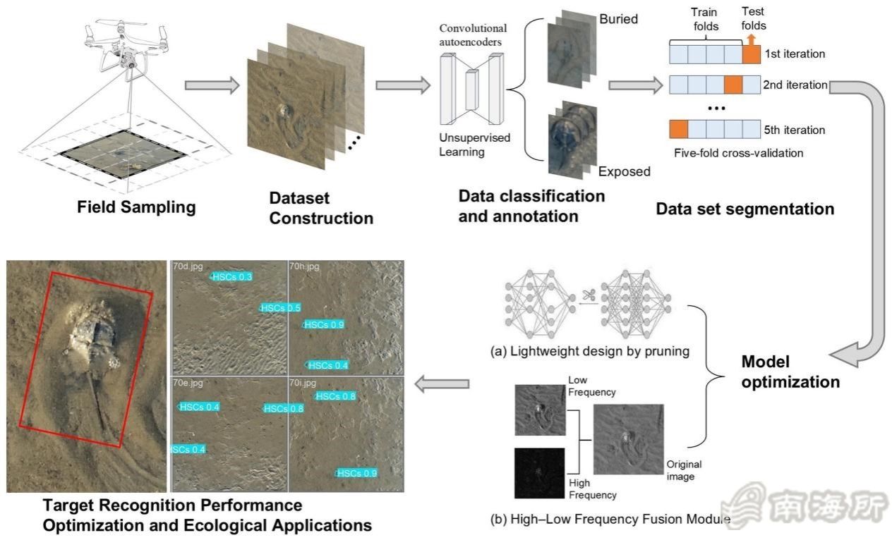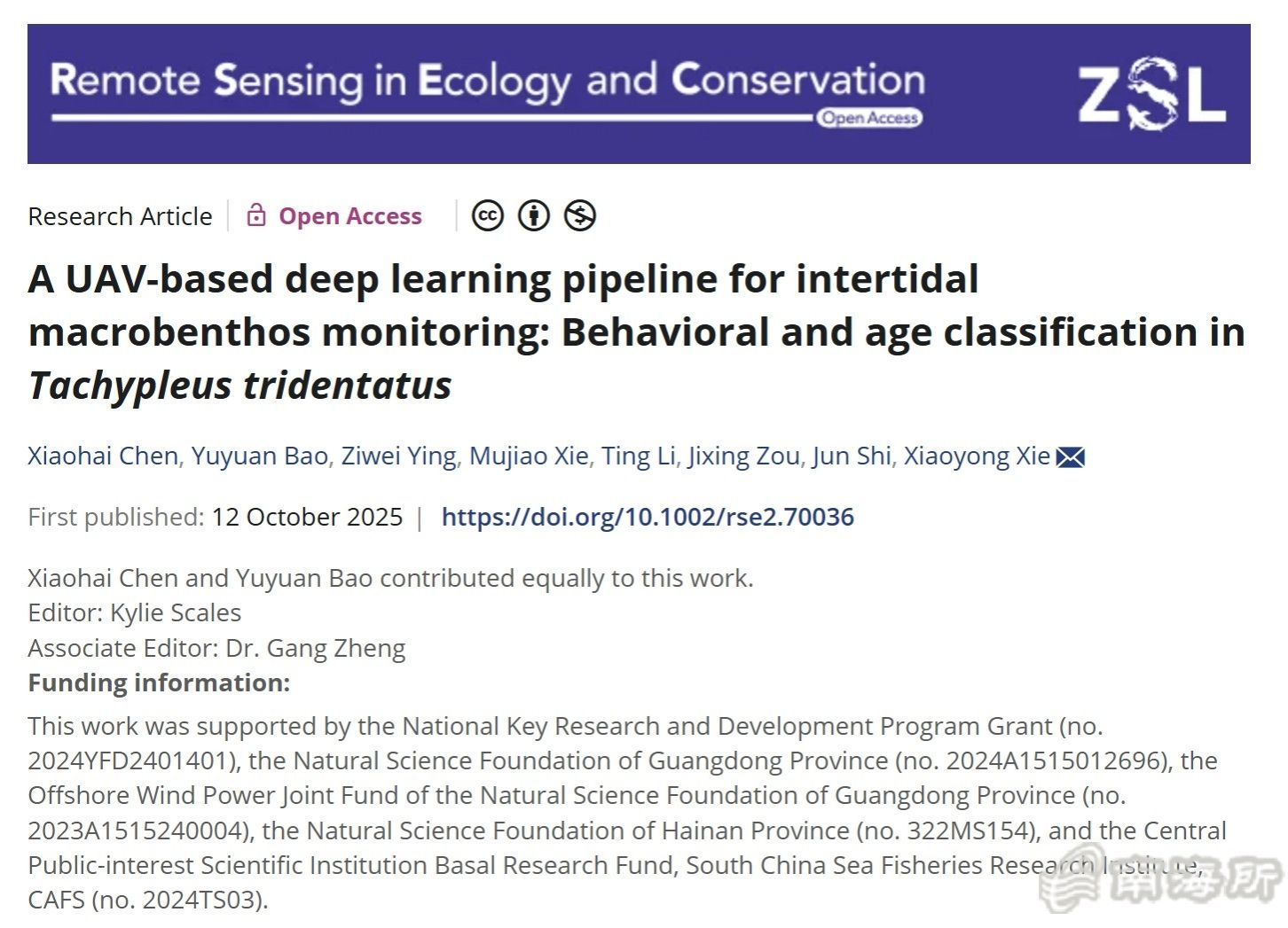 在全球生物多样性保护日益受到关注的今天,如何高效、精准监测潮间带濒危物种,已成为生态学与保护生物学面临的重要挑战。近日,中国水产科学研究院南海水产研究所中华鲎保护科研团队在国际生态学与保护遥感权威期刊?span style="font-family: "times new roman";">Remote Sensing in Ecology and Conservation》(JCR Q1, IF=4.3,Acceptance rate = 16%)上发表了题为?span style="font-family: "times new roman";">A UAV‐based deep learning pipeline for intertidal macrobenthos monitoring: Behavioral and age classification in Tachypleus tridentatus”的研究论文。该研究首次构建基于无人机与深度学习的潮间带大型底栖动物智能监测技术体系,成功实现对濒危物种中华鲎的个体识别、行为分类与年龄结构推断,为物种保护提供了技术新支撑。该论文由联合培养博士研究生陈晓海与鲍虞圆工程师担任共同第一作者,颉晓勇副研究员为通讯作者?/p>